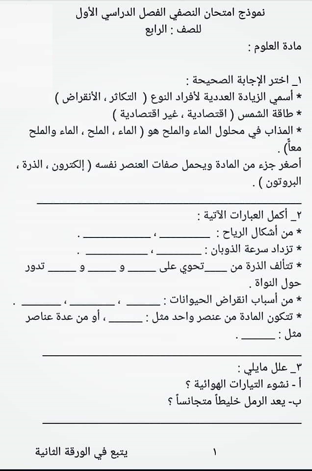 نموذج امتحان نصفي في العلوم للصف الرابع الفصل الاول