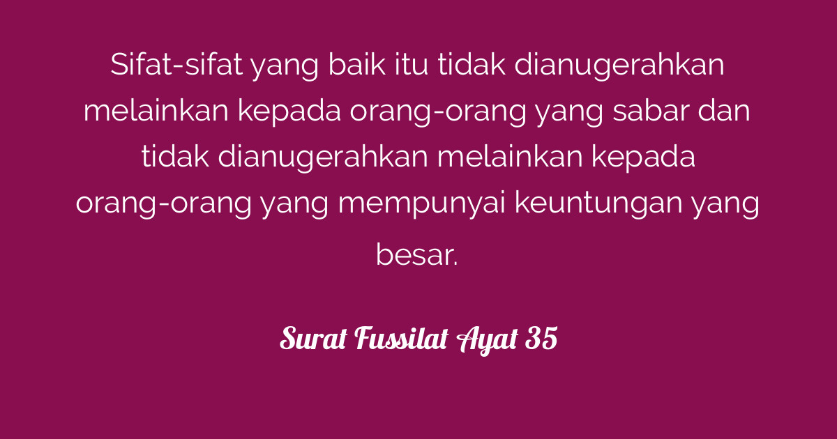 وما يلقاها إلا الذين صبروا وما يلقاها إلا ذو حظ عظيم artinya. القول في تأويل قوله تعالى. و م ا ي ل ق اه ا إ لا ال ذ ين ص ب ر وا و م ا ي ل ق اه ا إ لا ذ و ح ظ ع ظ يم 35 يقول تعالى ذكره. وما يقبل هذه الوصية ويعمل بها إلا من صبر على ذلك فإنه يشق على النفوس وما يلقاها إلا ذو حظ عظيم أي. Sifat sifat yang baik itu tidak dianugerahkan melainkan kepada orang orang yang sabar dan tidak dianugerahkan melainkan kepada orang orang yang mempunyai keuntungan yang besar.